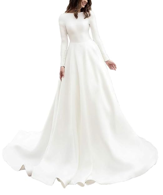 Alilith Z Elegant Boat Neck Satin Wedding Dresses For Bride 2019 Long Sleeve Bridal Wedding Gowns For Women With Train